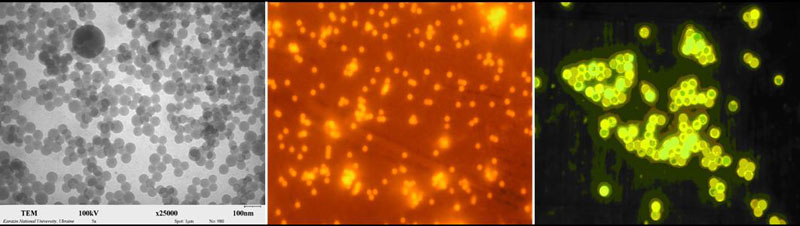 Polysterene nanospheres stained by fluorescent dyes for bioappications