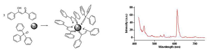 Nanoparticles EuDBM_TPPO/SiO2 (core Eu chelate complex/ SiO2 shell) synthesised by our group Luminescence spectrum of EuDBM_TPPO/SiO2 nanoparticles in water (exit. 400 nm)